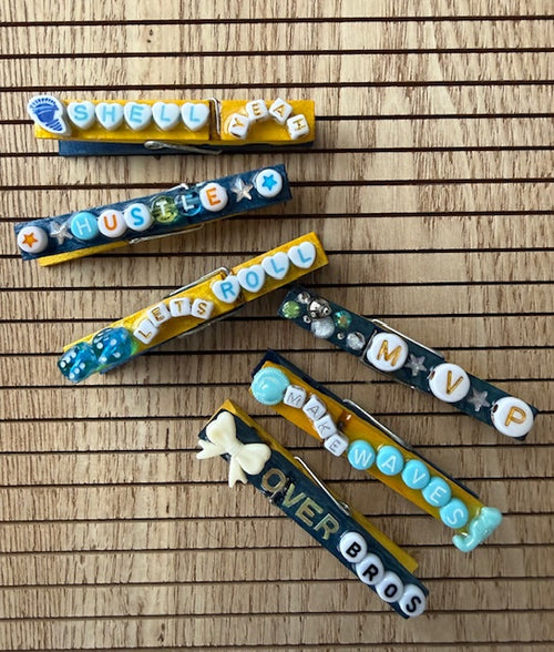 Volleyball - yellow and pink Cherry Bomb, GOAT, Fetch the W, MVP, Okay Queen, and Hoppsss -